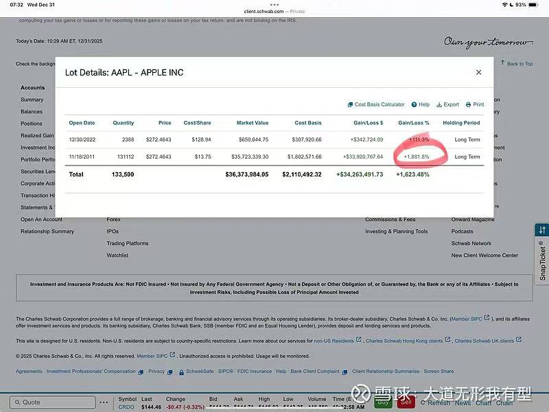 圖片顯示,段永平的賬號分別于2011年11月和2022年12月買入蘋果股票,第一次購入13.1萬股,平均價13.75美元/股;第二次購入2388股,平均價128.94美元/股。兩次投資分別為段永平帶來3392萬美元、34.27萬美元的收益,收益率高達1881.8%、111.3%。