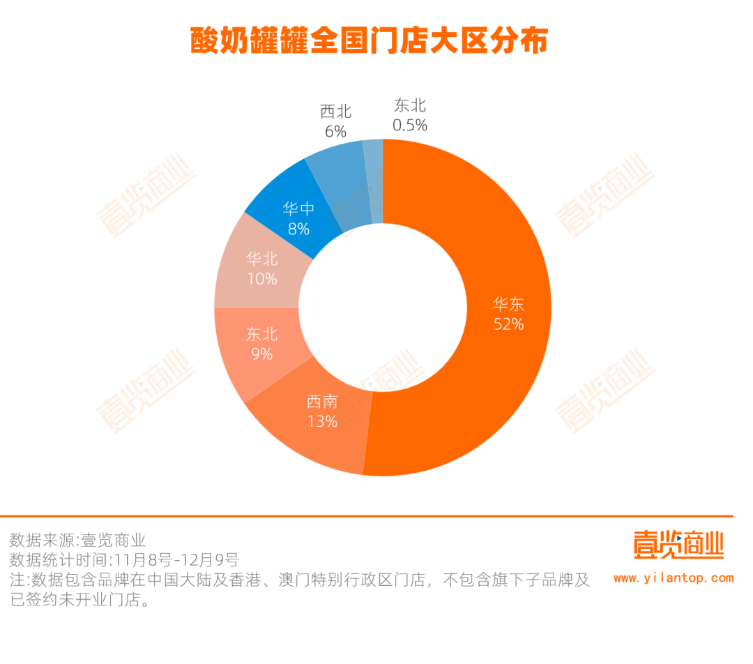 數(shù)據(jù)印證了這一判斷。據(jù)茶咖觀察統(tǒng)計,11月8日至12月9日期間,酸奶罐罐關閉52家門店,其中新一線城市關店數(shù)量占閉店總數(shù)的28.85%,且高達86.54%的門店位于購物中心。