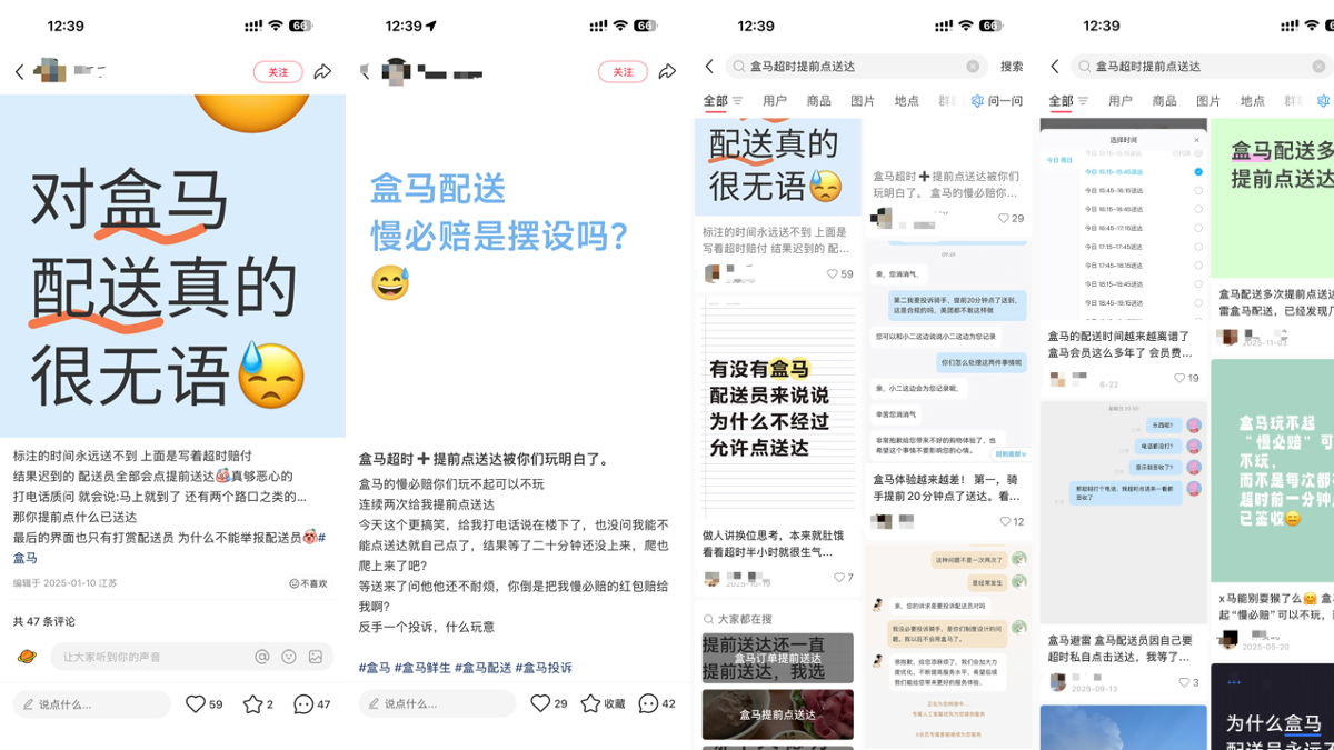 在小紅書等多個(gè)平臺(tái)上可以看到有消費(fèi)者吐槽,并聲稱“盒馬你玩不起可以不玩”。這是因?yàn)楹旭R在配送上承諾,如果晚送達(dá)超過10分鐘,將給消費(fèi)者補(bǔ)償3-10元。