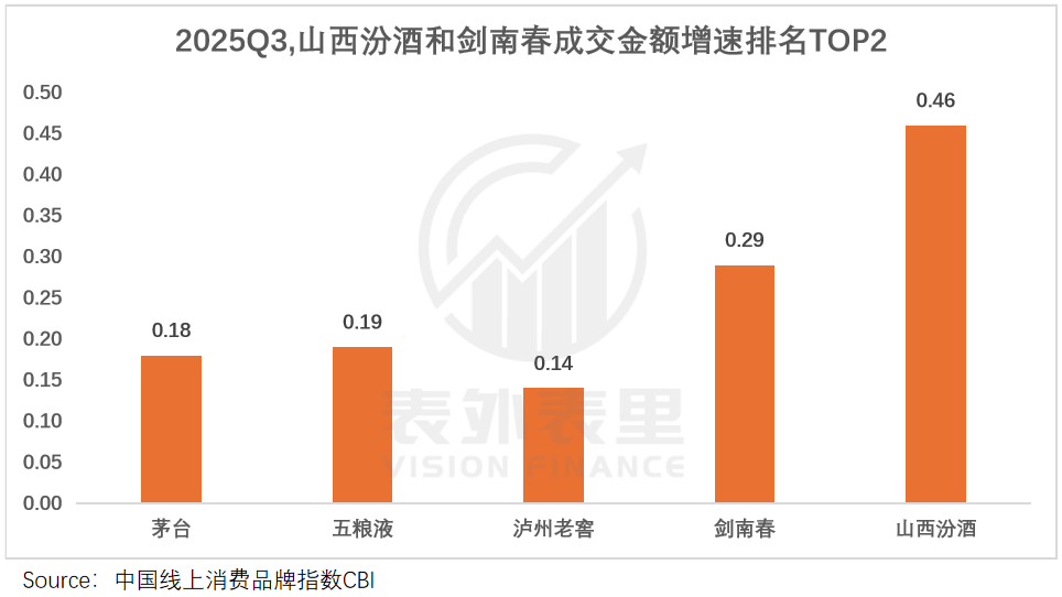 新喝法、新場景、新營銷全面推動下,品牌拉進了與年輕群體的距離,汾酒、劍南春三季度的CBI指數(shù)中,18-29歲成交金額增速領(lǐng)先。這也直接助推業(yè)績逆勢增長,山西汾酒是2025Q3唯三實現(xiàn)營收增長的上市酒企。