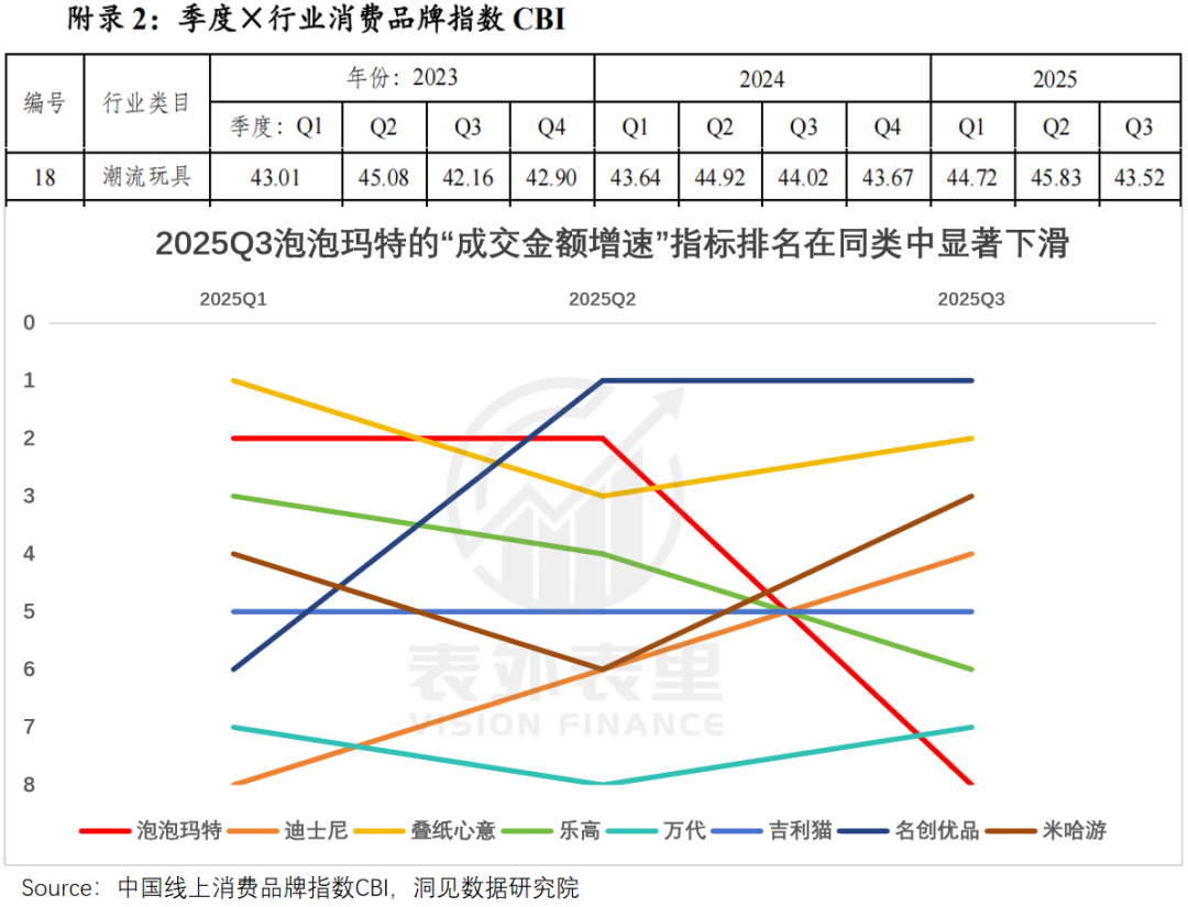 最新的CBI指數(shù)顯示,潮流玩具行業(yè)CBI指數(shù)同比環(huán)比均下滑,其中泡泡瑪特“成交金額增速”排名下降明顯。