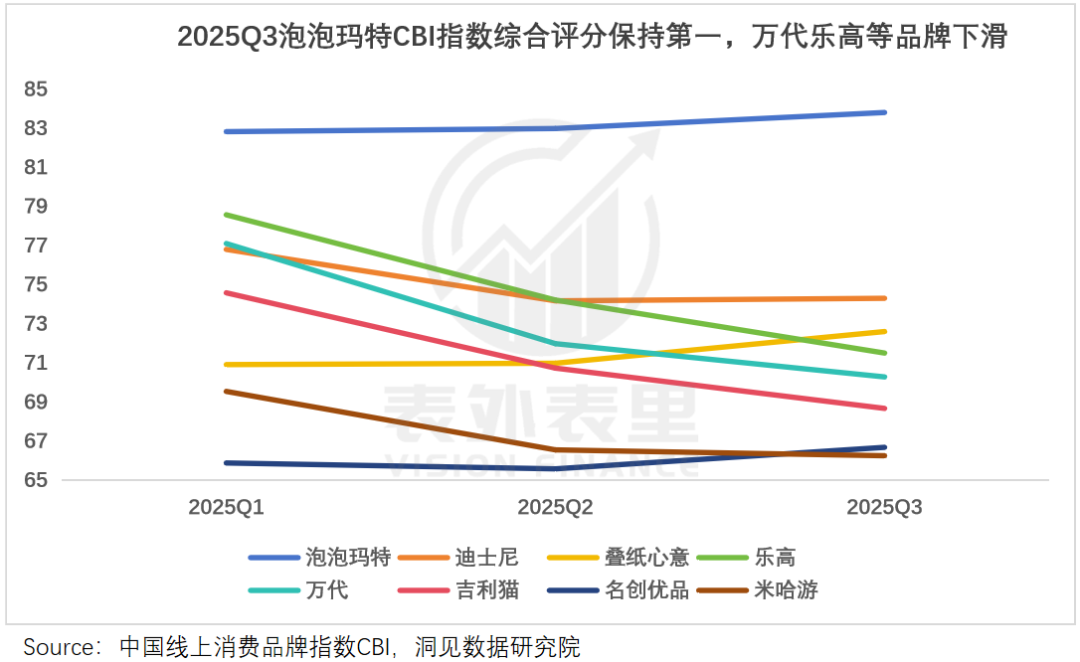 拆解CBI細節(jié)指標(biāo)會發(fā)現(xiàn),泡泡瑪特仍穩(wěn)坐行業(yè)“綜合評分”第一,反而是樂高、萬代等品牌排名下滑,拖著行業(yè)景氣度下行。這說明,行業(yè)格局在進一步分化,利好泡泡瑪特等頭部品牌。