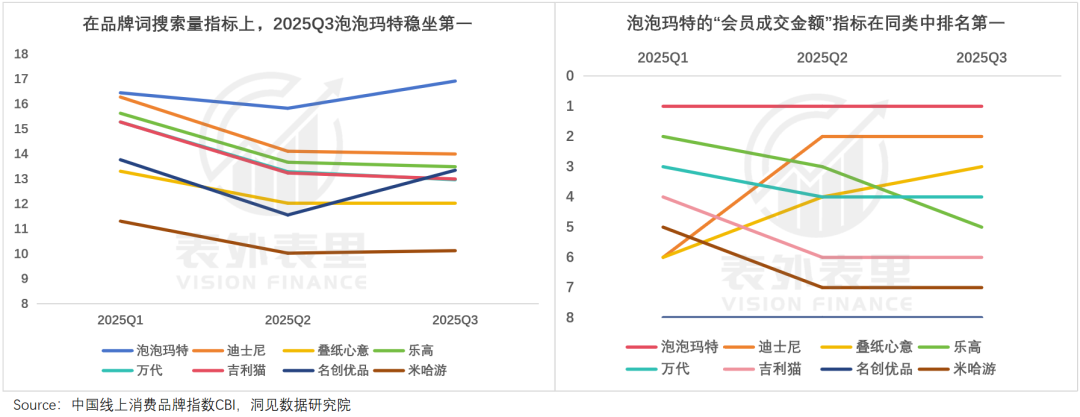 進一步拆解泡泡瑪特的細節(jié)指標(biāo)可以看到,其知名度(如品牌詞搜索量)、忠誠度(如會員成交金額)等指標(biāo)排名仍領(lǐng)先??梢?,大家只是少買Labubu了,但并不少買泡泡瑪特,品牌勢能依然抗打。