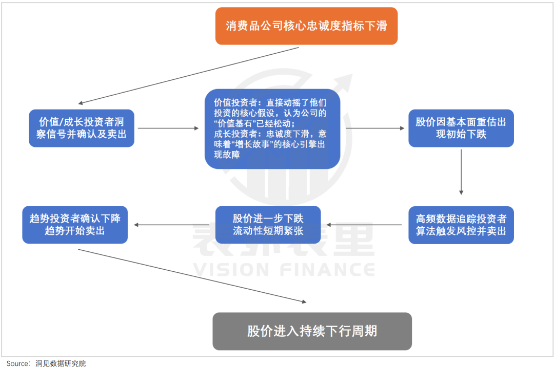 這些指標(biāo)指向的,是顧客忠誠度的下滑。而在消費品行業(yè),忠誠度是觀察消費品公司“護城河”深淺、商業(yè)模式壁壘的關(guān)鍵先行指標(biāo),一旦不及預(yù)期,各類投資者都將出現(xiàn)不同層面的邏輯破壞,進而集體撤退。