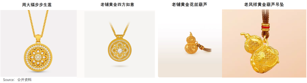 可以看到,周大?!皞鞒小?、老鳳祥非遺花絲等系列,與老鋪的產(chǎn)品仿佛異父異母的“親姐妹”。