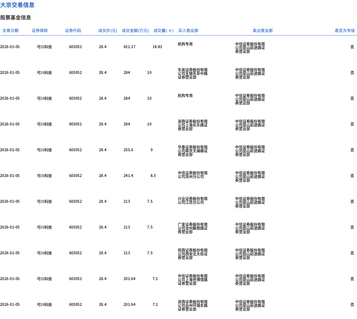 1月5日,可川科技大宗交易成交149.03萬股,成交額4232.45萬元,占當(dāng)日總成交額的16.77%,成交價28.4元,較市場收盤價34.71元折價18.18%。
