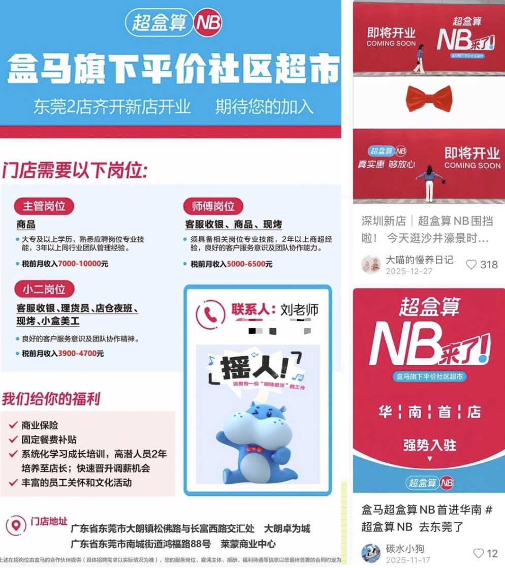 界面新聞在盒馬超盒算NB的招聘工作帖子也可以檢索到,其中一條招聘東莞超盒算NB門店店長(zhǎng)的信息顯示,薪資水平在12-18K,一年16薪。