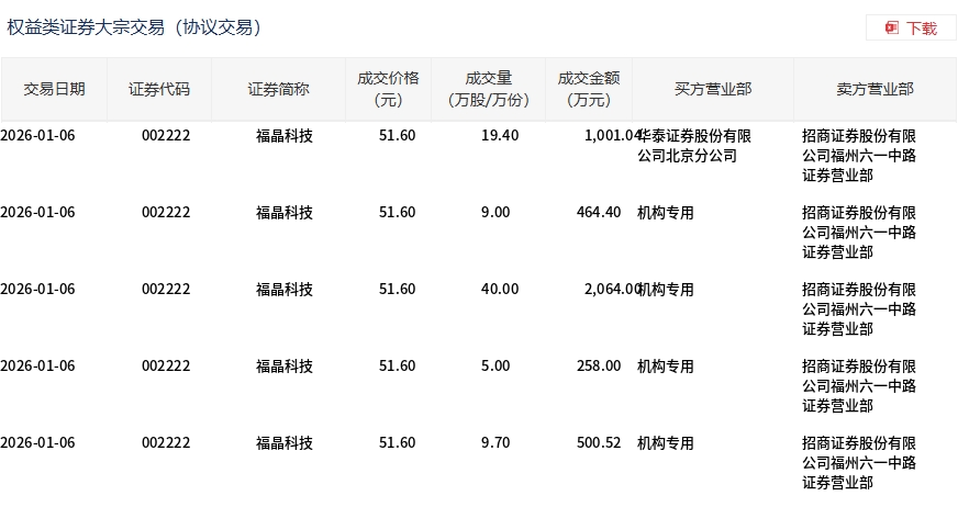 1月6日,福晶科技大宗交易成交83.1萬股,成交額4287.96萬元,占當(dāng)日總成交額的3.45%,成交價(jià)51.6元,較市場(chǎng)收盤價(jià)58.16元折價(jià)11.28%。