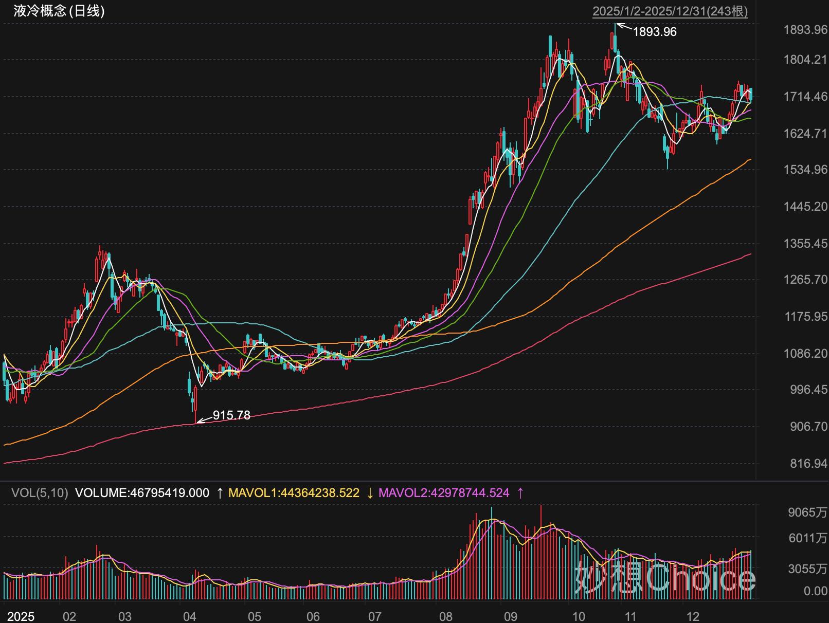 市場熱度,已在資本市場上盡顯。2025年,液冷概念板塊(861500.EI)全年累計漲幅高達59.91%,板塊內(nèi)超兩成個股實現(xiàn)股價翻倍,奕東電子(301123.SZ)、英維克、同飛股份(300990.SZ)等漲幅居前。