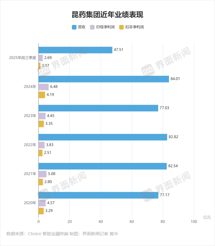 2025年前三季度,昆藥集團的營收為47.5億元,同比下降18%;扣非凈利潤為1.17億元,同比下降近60%。
