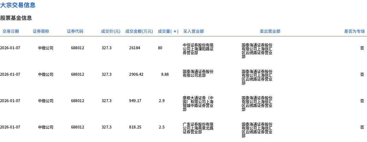 1月7日,中微公司大宗交易成交94.28萬股,成交額3.09億元,占當日總成交額的3.54%,成交價327.3元,較市場收盤價352.34元折價7.11%。