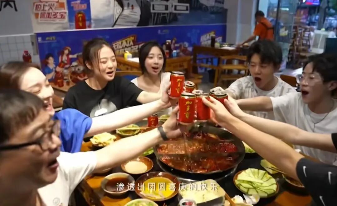比如,在一則主打“吃火鍋就喝加多寶”的廣告中,畫面里熱油翻滾、紅油冒泡,一群年輕人圍坐大笑,手邊整齊擺著冰鎮(zhèn)紅罐。搭配“辣到冒煙?一罐加多寶,火氣秒退散”的文案,堅持怕上火的經(jīng)典定位,還將主角從家庭聚餐換成了Z世代社交。