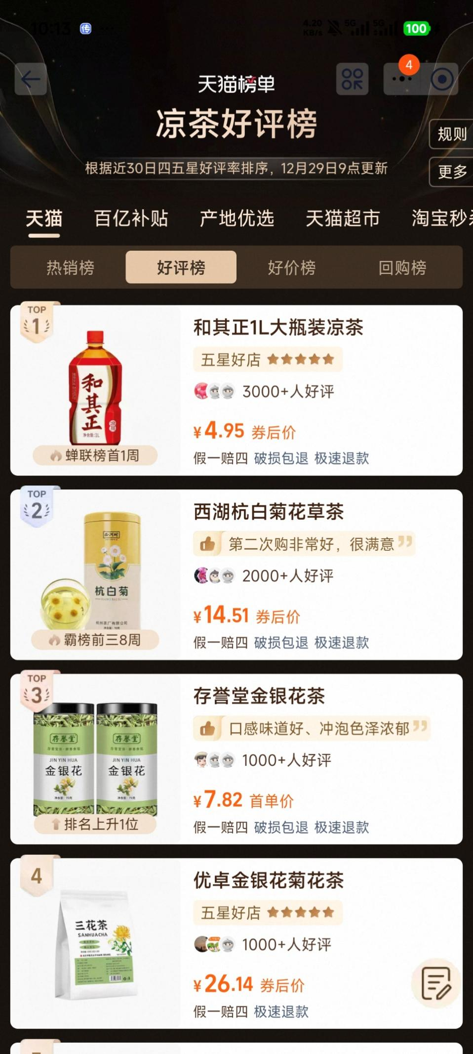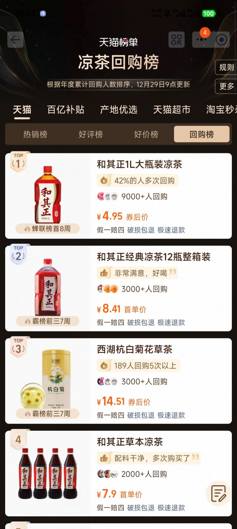 搜索天貓涼茶榜單,無論是以銷量為王的熱賣榜、以用戶口碑為核心的好評榜,還是最能反映品牌忠誠度與產(chǎn)品復(fù)購力的回購榜,占據(jù)前列(Top 20名)的都是王老吉、和其正、優(yōu)卓養(yǎng)生涼茶包、憶江南金銀花茶等品牌。