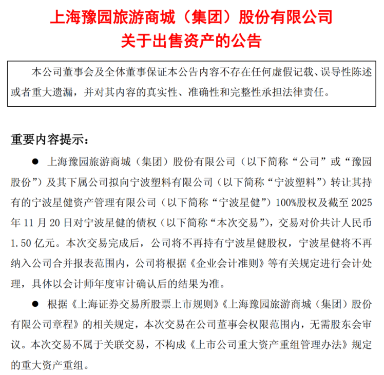 在12月17日,豫園股份一則公告引起市場關(guān)注:公司擬將寧波星健資產(chǎn)管理有限公司100%股權(quán)及相關(guān)債權(quán),以1.5億元總價轉(zhuǎn)讓給寧波塑料有限公司。