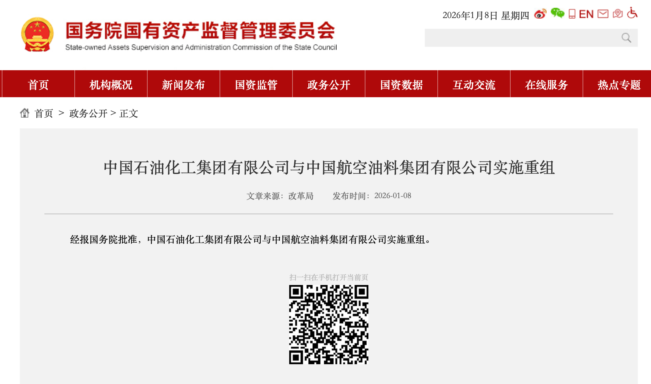 據(jù)國(guó)務(wù)院國(guó)資委網(wǎng)站,經(jīng)報(bào)國(guó)務(wù)院批準(zhǔn),中國(guó)石油化工集團(tuán)有限公司與中國(guó)航空油料集團(tuán)有限公司實(shí)施重組。