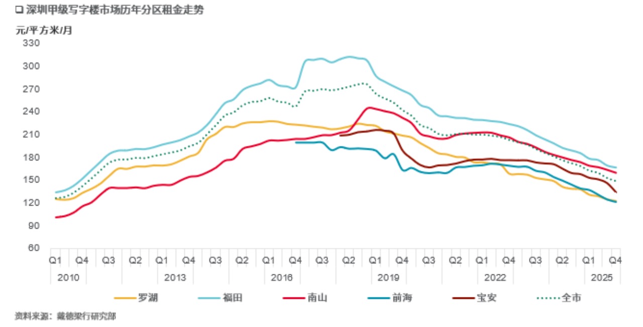 截至2025年四季度末,深圳甲級寫字樓平均租金跌至每月每平方米149.4元,較上年末下滑11.7%。不過不同片區(qū)的表現(xiàn)分化明顯:核心區(qū)優(yōu)質(zhì)項目憑借完善的配套與優(yōu)越的區(qū)位,租金降幅相對可控;而新興片區(qū)的部分項目,為了爭奪客戶不得不放下身段,通過大幅降價、延長免租期等方式讓利,區(qū)域租金差距進(jìn)一步拉大。