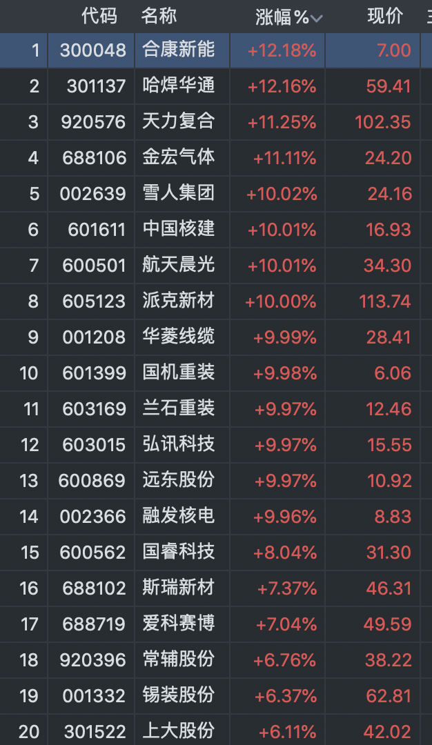 當(dāng)天,可控核聚變板塊內(nèi)超七成個股上漲,合康新能(300048.SZ)、哈焊華通(301137.SZ)、天力復(fù)合(920576.BJ)、雪人集團(tuán)(002639.SZ)等多股漲停。