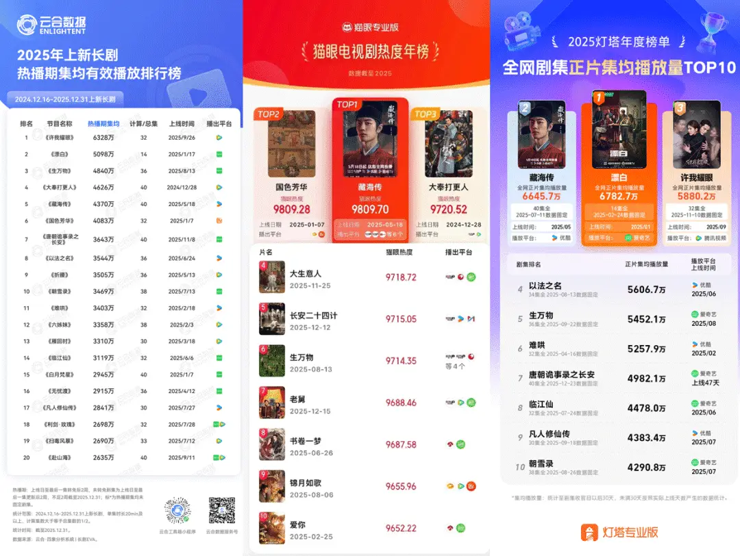 變與不變之中究竟得失幾何?本文將結合云合、燈塔、貓眼、德塔文等第三方平臺公布的年度數(shù)據(jù)報告或榜單,詳細回顧2025年長劇市場在這一年的具體表現(xiàn),也為剛到來的2026提供可供參考的一二經(jīng)驗及反思。
