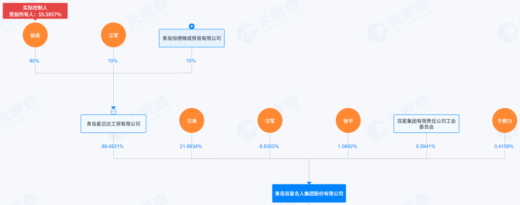 (實(shí)際控制人股權(quán)結(jié)構(gòu)示意圖)(注:受益所有人徐英持股55.5857%,通過青島星邁達(dá)工貿(mào)有限公司間接控股雙星名人69.4821%;汪海直接持股21.8834%,汪軍直接持股6.5353%,其余股權(quán)由徐平、雙星集團(tuán)有限責(zé)任公司工會(huì)委員會(huì)等分別持有)