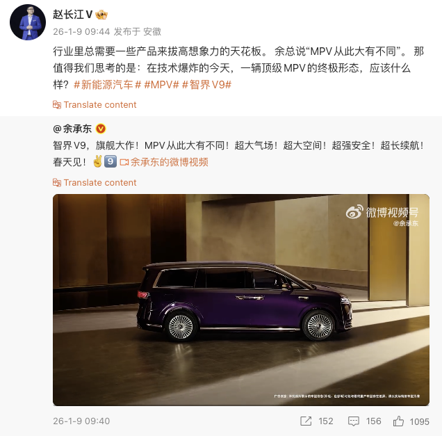 1月9日,余承東在微博發(fā)文宣布,鴻蒙智行首款旗艦MPV——智界V9將于春天正式亮相。趙長江隨后轉(zhuǎn)發(fā)該微博,并為智界V9預(yù)熱,稱“行業(yè)里總需要一些產(chǎn)品來拔高想象力的天花板”。有網(wǎng)友在評論區(qū)詢問趙長江如何評價智界V9這臺車,他回復(fù)道:“保守估計三年內(nèi)沒有對手。”此前電廠援引多方信源稱,前比亞迪騰勢品牌總經(jīng)理、騰勢方程豹直營事業(yè)部總經(jīng)理趙長江已加入奇瑞汽車和華為合作的品牌智界汽車,擔(dān)任營銷總經(jīng)理一職。