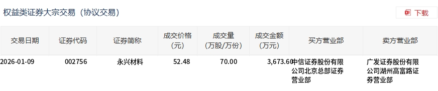 1月9日,永興材料大宗交易成交70萬(wàn)股,成交額3673.6萬(wàn)元,占當(dāng)日總成交額的5.72%,成交價(jià)52.48元,較市場(chǎng)收盤(pán)價(jià)53.83元折價(jià)2.51%。