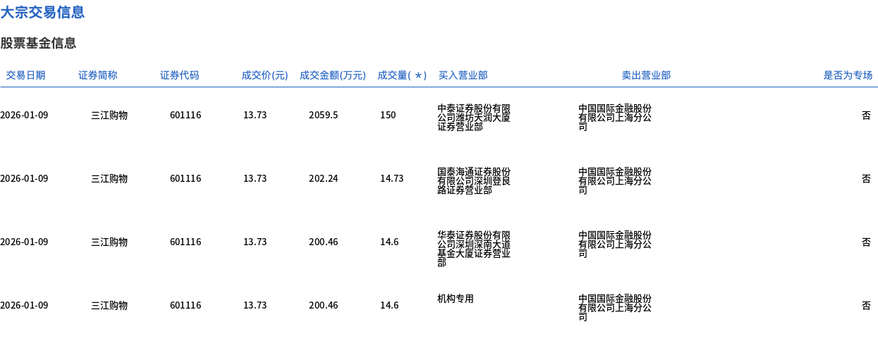 1月9日,三江購物大宗交易成交193.93萬股,成交額2662.66萬元,占當日總成交額的3.55%,成交價13.73元,較市場收盤價15.68元折價12.44%。