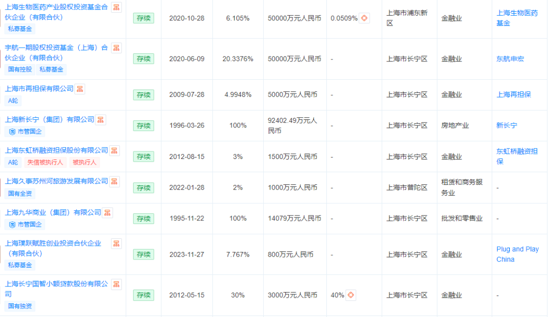 從投資的金融機(jī)構(gòu)看,長寧國資在基金、小貸、擔(dān)保等領(lǐng)域均有布局,包括上海生物醫(yī)藥產(chǎn)業(yè)股權(quán)投資基金合伙企業(yè)(有限合伙)、宇航一期股權(quán)投資基金(上海)合伙企業(yè)(有限合伙)、上海東虹橋融資擔(dān)保、上海長寧國智小額貸款股份有限公司、上??苿?chuàng)母基金三期等都有其參股的身影。