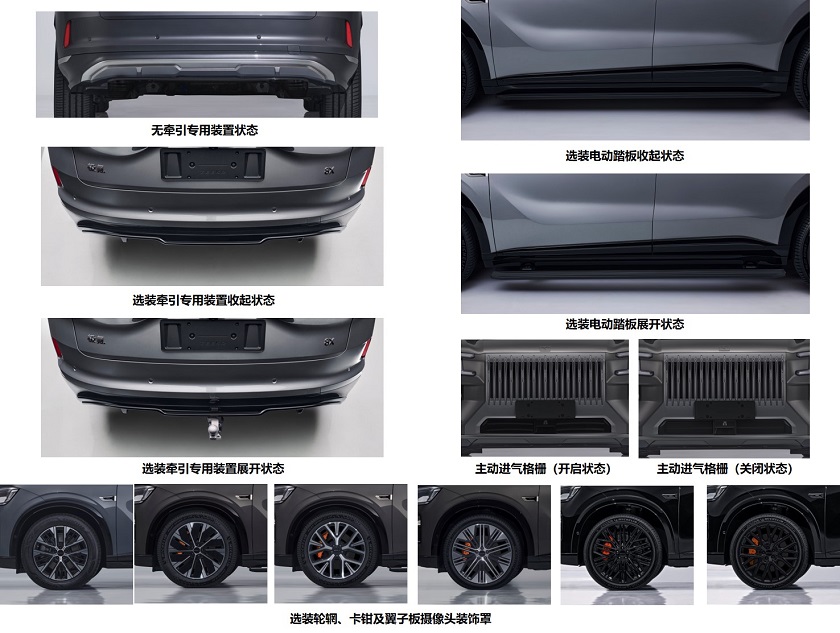 車尾采用貫穿式尾燈設(shè)計(jì),下沿線條為分段式造型,與9X形成區(qū)分。車身尺寸方面,極氪8X長寬高為5100/1998/1780毫米,軸距3069毫米,整體略小于9X,但仍處于大型SUV主流尺寸區(qū)間。申報(bào)信息顯示,新車提供黑化風(fēng)格外觀套件,并可選電動(dòng)側(cè)踏和電動(dòng)牽引裝置,具備2000公斤牽引資質(zhì)。