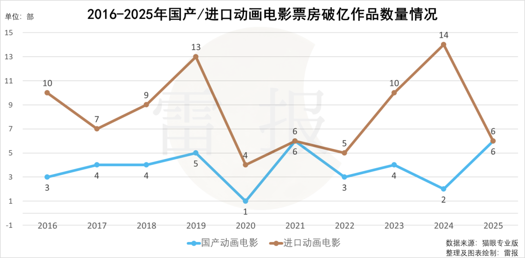 不過從國產(chǎn)/進(jìn)口動畫電影的對比來看,今年破億作品數(shù)量的減少主要是進(jìn)口動畫表現(xiàn)不佳導(dǎo)致,國產(chǎn)6部破億作品已經(jīng)是歷史最好水平。但考慮到這十年是國產(chǎn)動畫電影的快速崛起期,破億作品數(shù)量始終未能突破6部的瓶頸,也暴露出行業(yè)的“頭部依賴”困局。動畫電影行業(yè)仿佛一直是“小圈子的游戲”,票房的增長高度綁定光線傳媒、追光動畫、華強(qiáng)方特等頭部企業(yè)的產(chǎn)能與內(nèi)容輸出節(jié)奏,腰部創(chuàng)作力量嚴(yán)重不足,這也是為什么 “大小年”現(xiàn)象如此突出。