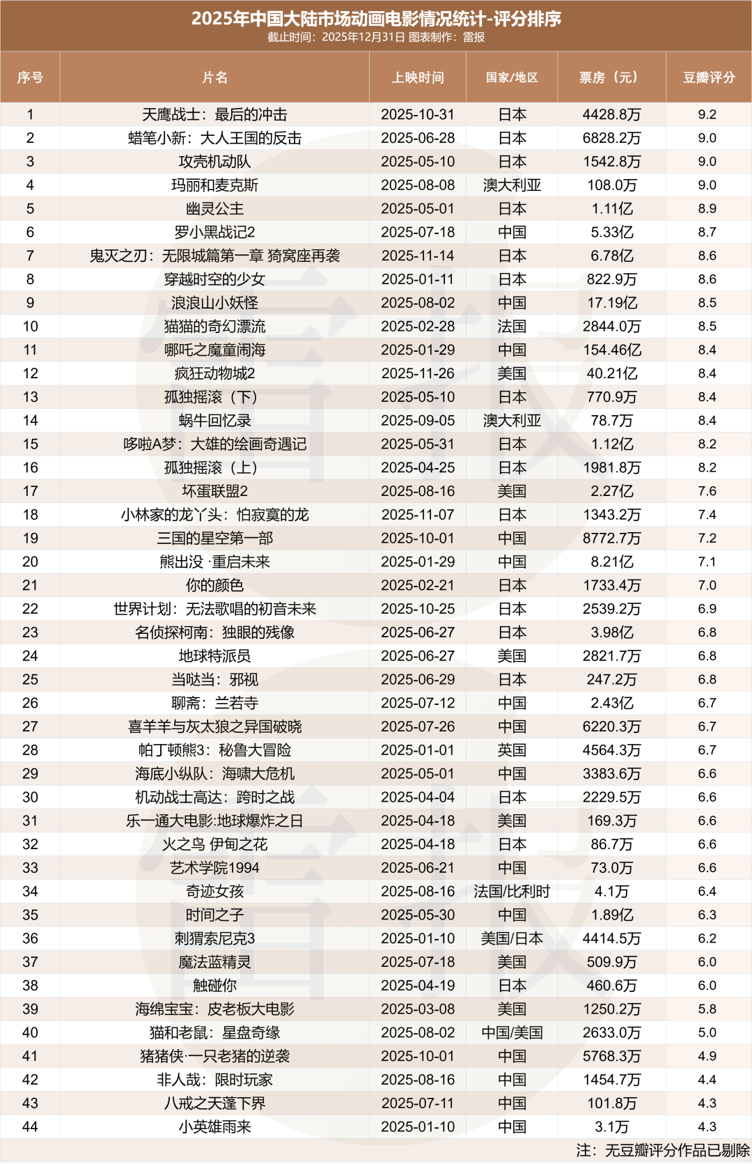 值得注意的是,評分前五的作品均為“老片新映”的經(jīng)典之作。若剔除這一類別,僅統(tǒng)計(jì)近兩年上映的新片,評分前五則依次為:《羅小黑戰(zhàn)記2》8.7分、《鬼滅之刃:無限城篇第一章 猗窩座再襲》8.6分、《浪浪山小妖怪》8.5分、《貓貓的奇幻漂流》8.5分、《哪吒之魔童鬧?!?.4分,三部熱映國產(chǎn)動畫全部上榜。