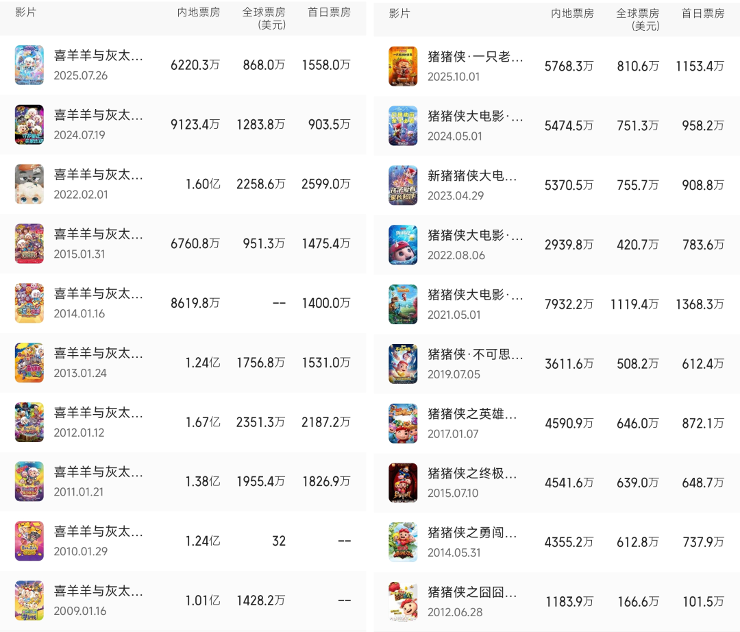 國產(chǎn)兒童動畫三巨頭中的“喜羊羊”和“豬豬俠”也表現(xiàn)平平。前者新作《喜羊羊與灰太狼之異國破曉》票房6220.3萬元,創(chuàng)下全系列10部動畫電影的新低;后者則在今年上映了20周年大電影《豬豬俠·一只老豬的逆襲》,且十分“聽勸”地采用了初代豬豬俠的形象,卻依舊因劇情短板未能達(dá)到預(yù)期,5768.3萬元的票房在系列10部作品中排名第二,但也只能算是中規(guī)中矩。