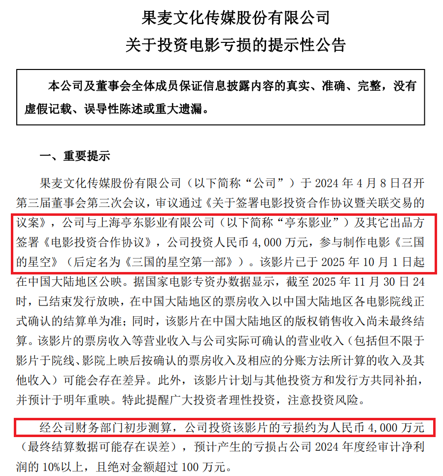 貓眼出品的《時間之子》倒是超出預(yù)期,作為奇幻愛情類動畫,其在王俊凱、周深等一眾明星勢能的加持下,斬獲1.89億元票房。相比之下,同樣有名人效應(yīng)的加持,《三國的星空第一部》的表現(xiàn)則不盡人意。該片手握三國大IP、易中天編劇、檀健次配音的豪華配置,上映前便收獲多圈層關(guān)注,最終卻因制作質(zhì)感粗糙、歷史改編脫離大眾認(rèn)知、受眾定位模糊等硬傷票房遇冷,僅獲8772.1萬元票房。出品方果麥文化公告顯示,其對該片的4000萬元投資額全數(shù)虧損,并計(jì)劃補(bǔ)拍重映。