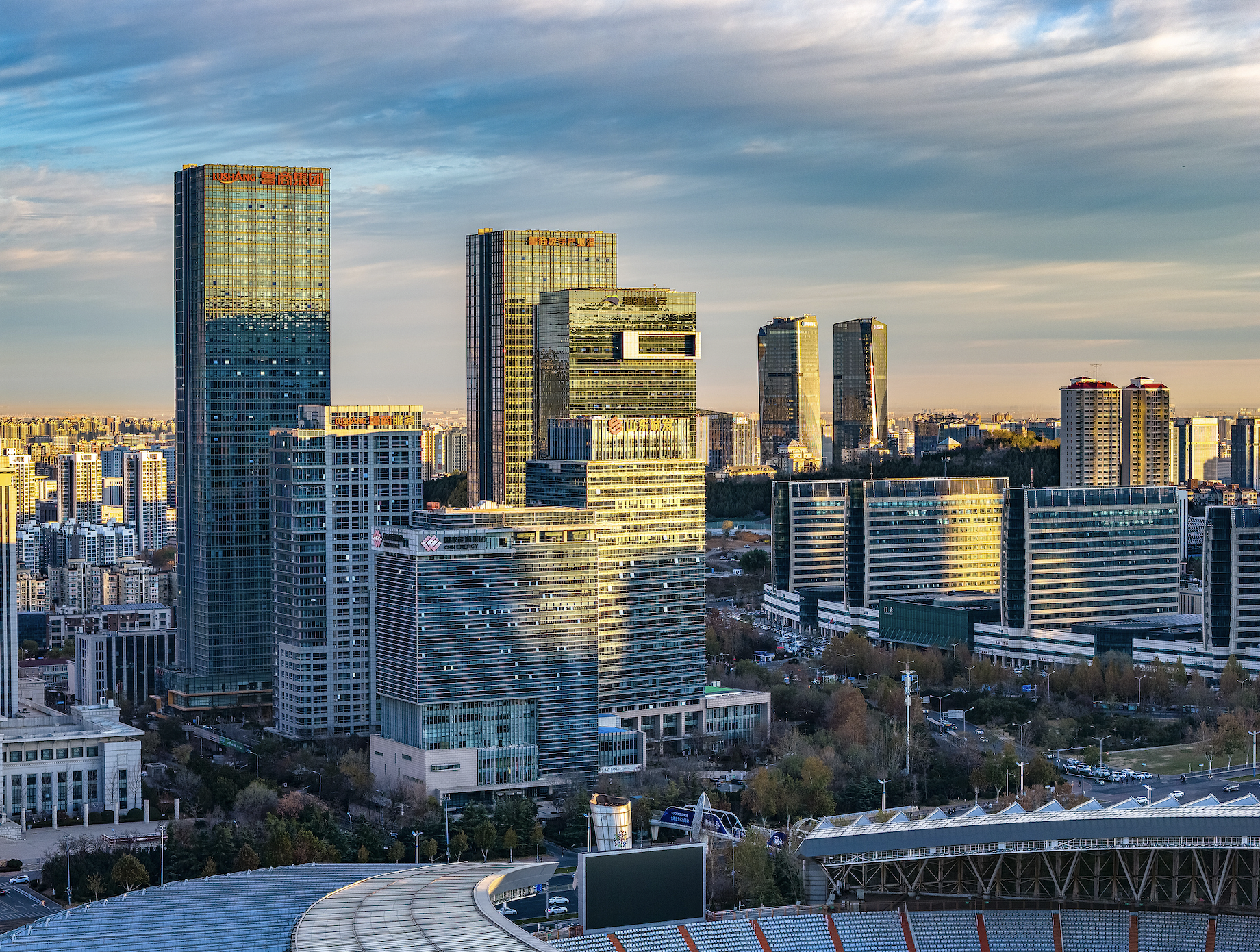 2025年12月5日,濟(jì)南冬季CBD奧體中心經(jīng)十路漢峪金谷日出朝霞航拍。圖片來(lái)源:CFP