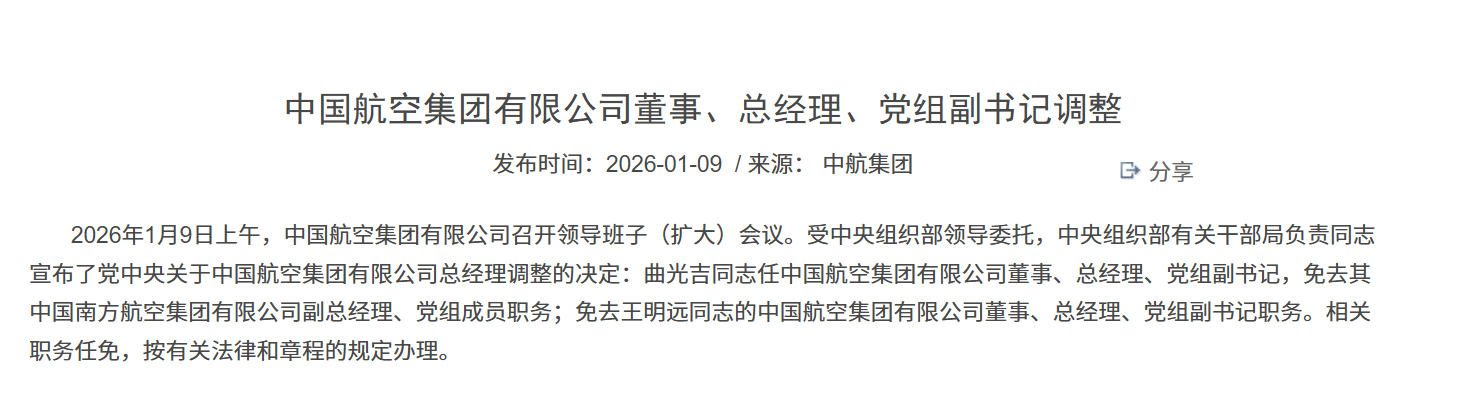中航集團(tuán)官網(wǎng)1月9日發(fā)布公告稱,原中國南方航空集團(tuán)有限公司(簡稱“南航”)副總經(jīng)理、黨組成員曲光吉出任中國航空集團(tuán)有限公司(簡稱“中航”)董事、總經(jīng)理、黨組副書記。