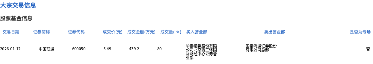 中國聯(lián)通今日大宗交易平價成交80萬股,成交額439.2萬元