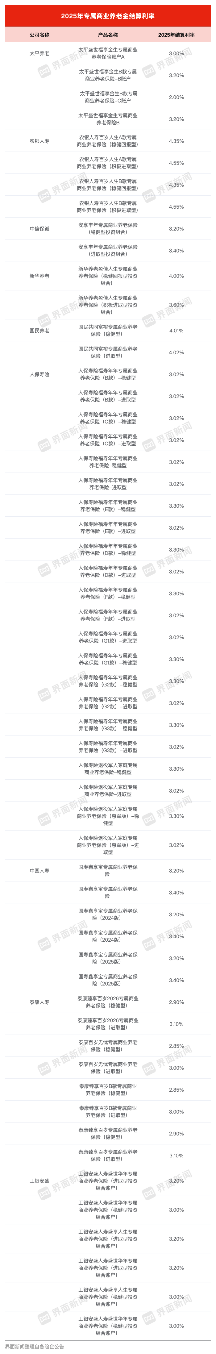 近日,多家險(xiǎn)企公布專屬商業(yè)養(yǎng)老保險(xiǎn)2025年結(jié)算利率,在壽險(xiǎn)市場(chǎng)預(yù)定利率降至2%時(shí),專屬商業(yè)養(yǎng)老保險(xiǎn)一枝獨(dú)秀,數(shù)款產(chǎn)品結(jié)算利率在3%以上。