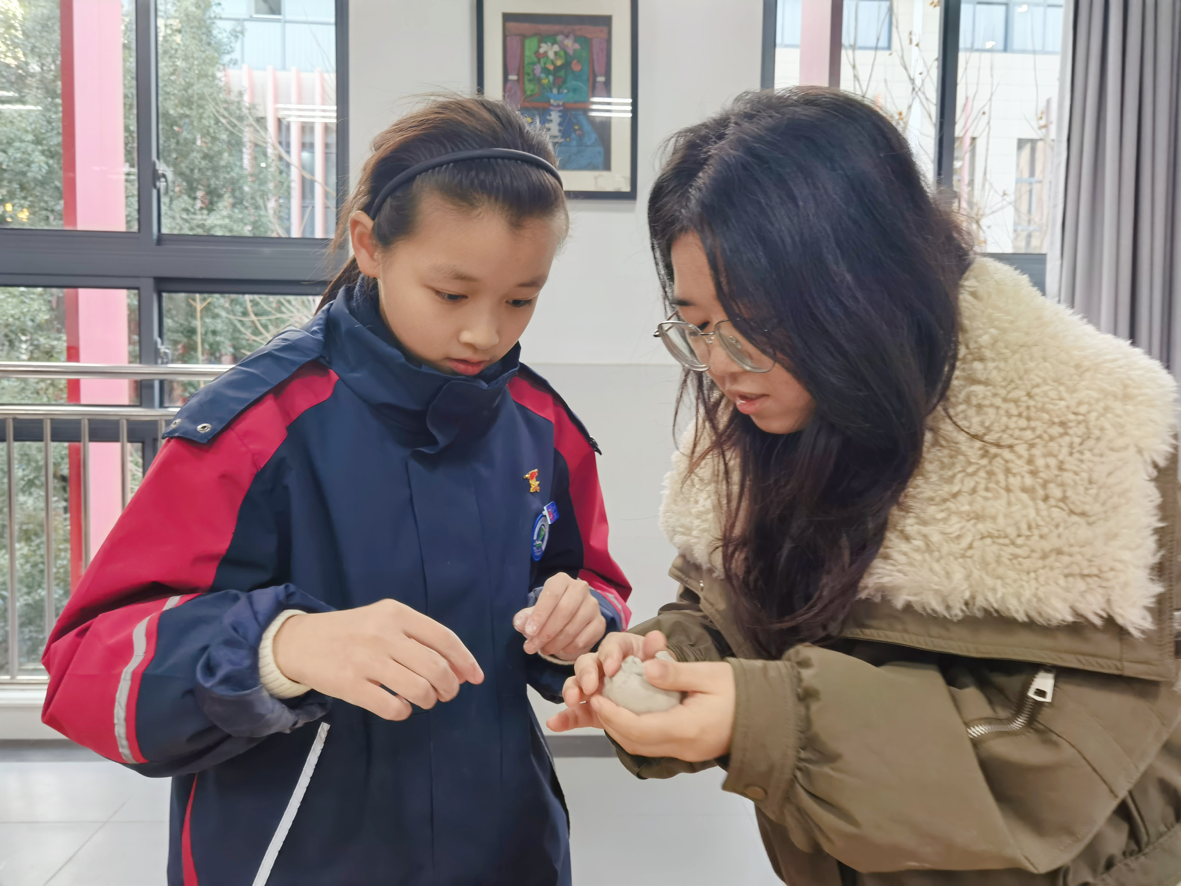 最讓人期待的動(dòng)手環(huán)節(jié)是親手制作一只越窯青瓷的小馬擺件。在大學(xué)生志愿者的一對(duì)一指導(dǎo)下,大家擼起袖子大展身手:揉泥排氣、塑形粘黏,有的捏出奔騰的駿馬,有的捏出呆萌的小馬駒?!吧眢w要塞紙團(tuán)、打通氣孔,不然燒的時(shí)候會(huì)炸裂……”“你可以讓小馬抬起前腿,看起來(lái)更有活力……”大學(xué)生們耐心示范技巧,及時(shí)解決同學(xué)們的創(chuàng)作難題,課堂上滿是泥土香氣與歡聲笑語(yǔ)。