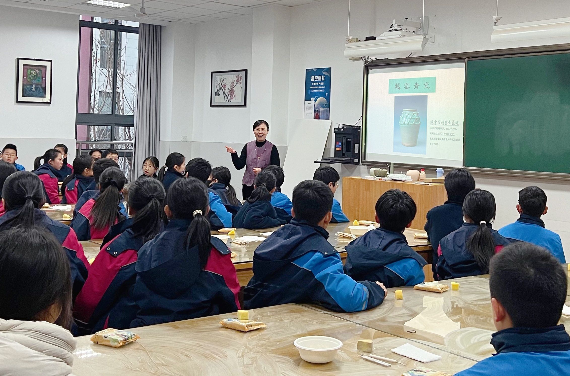活動(dòng)伊始,帶隊(duì)指導(dǎo)老師應(yīng)艷副教授的“非遺小課堂”就抓住了全場(chǎng)目光。她結(jié)合余姚、慈溪上林湖的窯址故事,用“千年母親瓷”“千峰翠色”等生動(dòng)表述,解鎖越窯青瓷的獨(dú)特魅力——從瓷土與礦石的天然原料,到練土、制坯、上釉、燒制的流程,再到“鐵元素+還原焰+1300℃高溫”的釉燒原理,原本深?yuàn)W的非遺知識(shí),在趣味講解中變得通俗易懂?!肮糯そ硾](méi)有溫度計(jì),卻能精準(zhǔn)把控火候,這就是了不起的匠心!”應(yīng)艷老師的話,讓初中生們對(duì)非遺技藝多了一份敬畏。