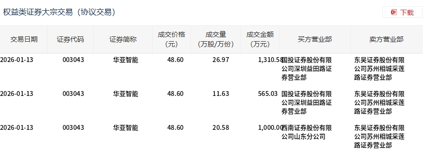 1月13日,華亞智能大宗交易成交59.18萬股,成交額2875.61萬元,占當(dāng)日總成交額的15.04%,成交價(jià)48.6元,較市場收盤價(jià)49.83元折價(jià)2.47%。