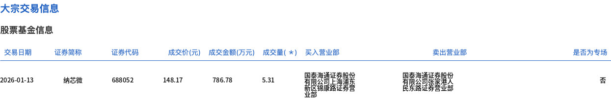 1月13日,納芯微大宗交易成交5.31萬(wàn)股,成交額786.78萬(wàn)元,占當(dāng)日總成交額的1.6%,成交價(jià)148.17元,較市場(chǎng)收盤(pán)價(jià)170.33元折價(jià)13.01%。