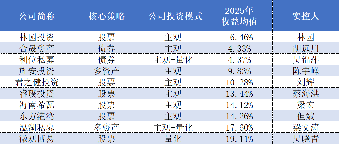 也有部分百億私募2025年的收益表現(xiàn)不盡如人意。其中,排在后十位的百億私募2025年的收益均值均不足20%,按照投資模式劃分,有7家為主觀私募,2家為主觀+量化私募,僅1家為量化私募。