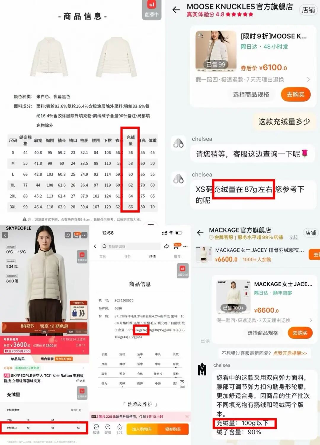 我隨機(jī)搜索了一下高價格帶的輕薄款羽絨服,從商場常見的某國產(chǎn)女裝品牌、某國產(chǎn)羽絨服初創(chuàng)品牌,到國際知名的專業(yè)羽絨服品牌,標(biāo)價幾千元但充絨量在100克以下的情況,并不少見。
