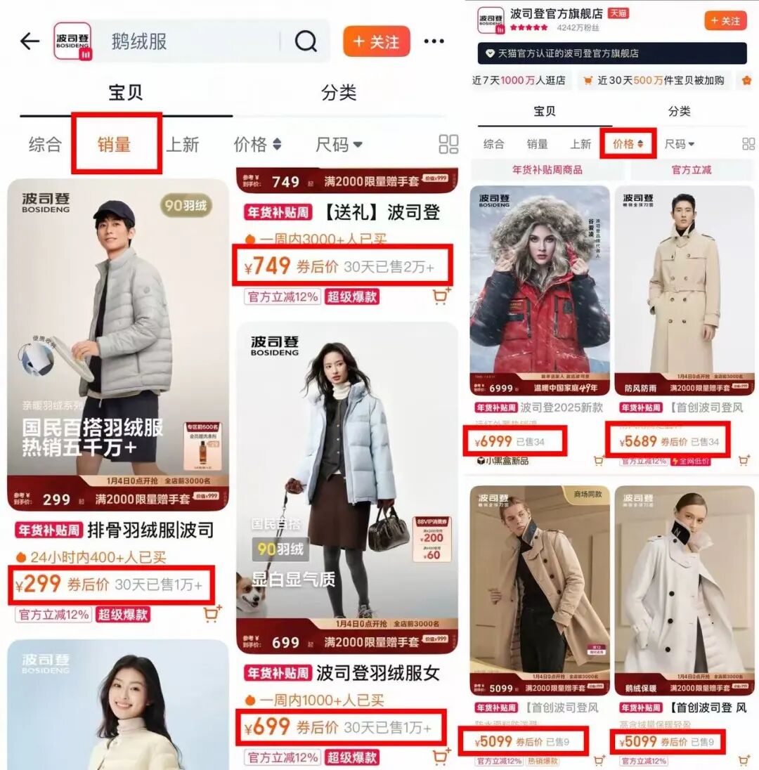 截至目前,在天貓的波司登官方旗艦店,銷量最高的前三款羽絨服價格分別為749元、299元、699元,30天銷量均在萬件以上。而價格最高的極寒系列羽絨服和商務(wù)系列羽絨服,定價均在5000元以上,銷量分別僅有34件和9件。