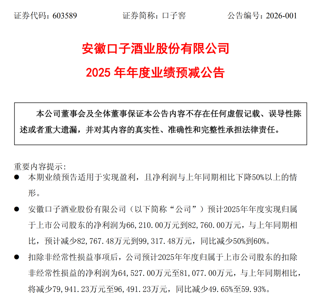 圖片來源:口子窖2025財(cái)報(bào)預(yù)告公告截圖