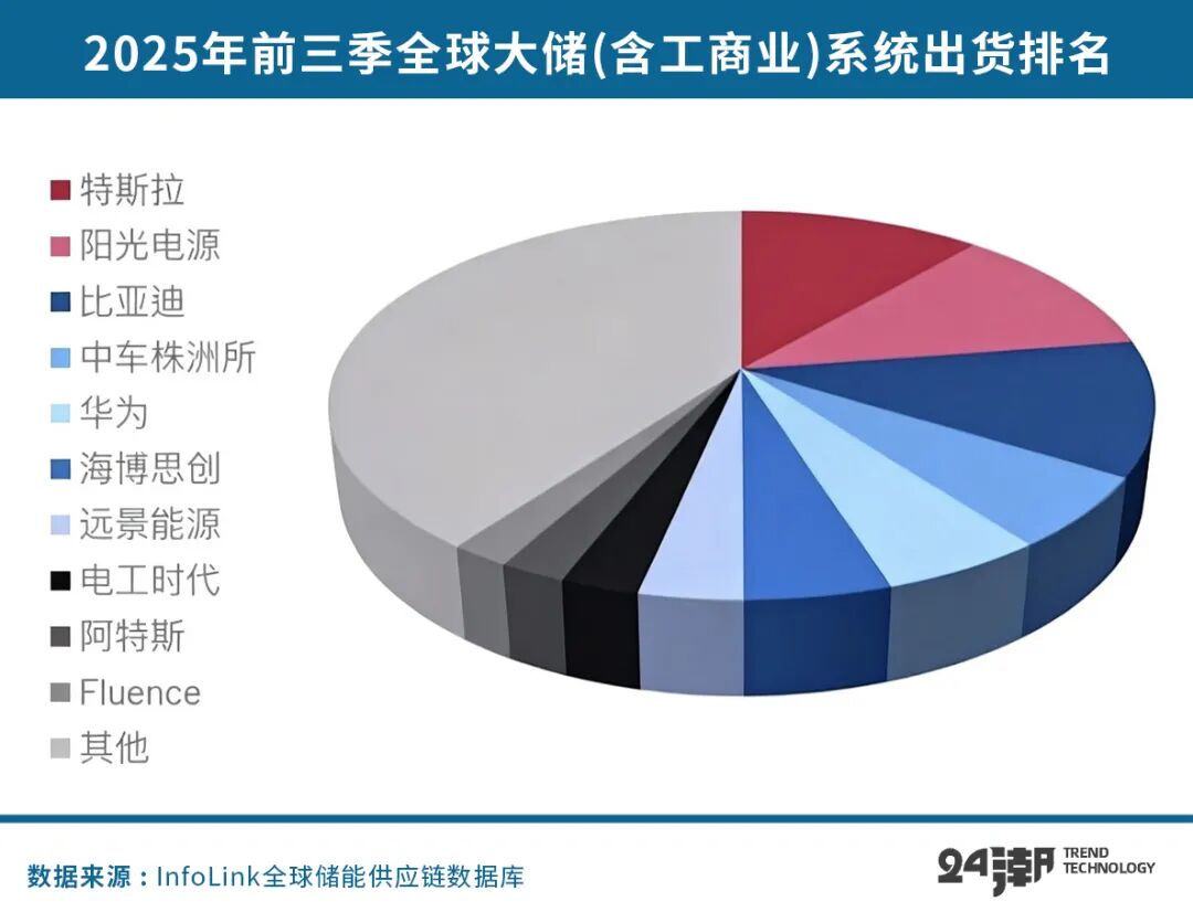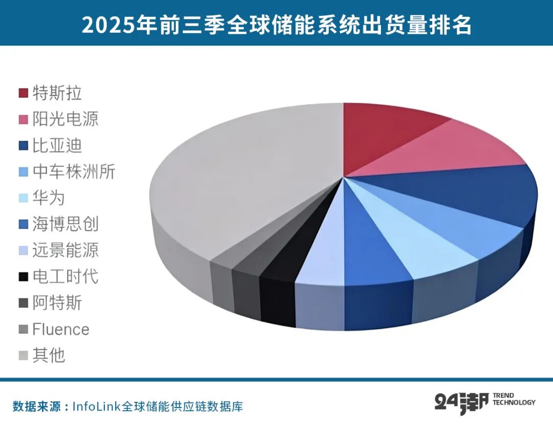 其次是,更高緯度,更激烈的競爭環(huán)境。伴隨全球儲能進入“大航?!?時代,除了陽光電源這一老對手外,我們可以看到,以特斯拉、比亞迪、中國中車等為代表的科技巨擘,在整個集團的資本、科技、全球化渠道等賦能與加持下都在加速向儲能領域滲透,且發(fā)展勢頭比華為更兇猛,這從全球儲能系統(tǒng)集成出貨量排名中就可見一斑(InfoLink數(shù)據(jù),25年前三季度全球儲能系統(tǒng)出貨量前五名依次為特斯拉、陽光電源、比亞迪、中車株洲所、華為)。