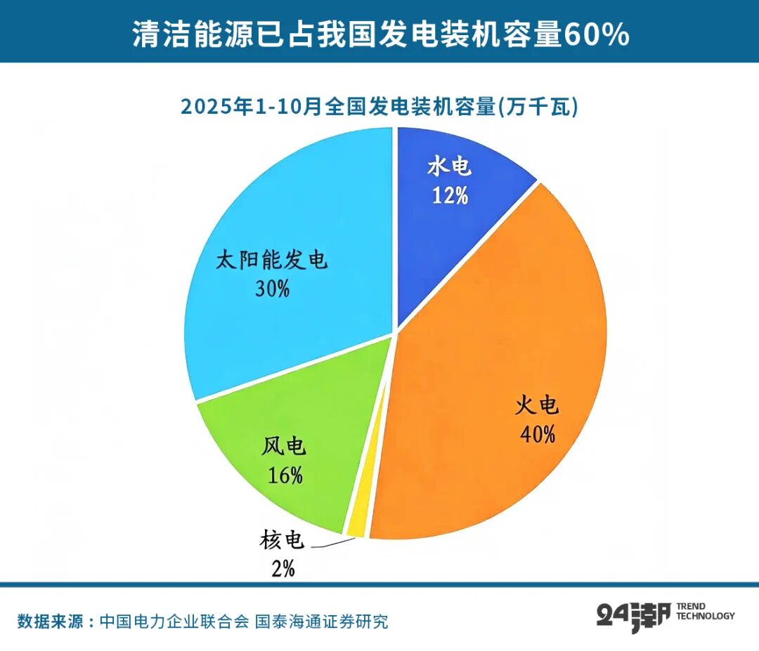 當前,我國能源結構正在發(fā)生根本性變化。2025年三季度末,全國可再生能源裝機接近22億千瓦,同比增長27.2%,占電力總裝機的59.1%,接近六成比例,風光發(fā)電合計裝機突破17億千瓦。發(fā)電量方面,可再生能源貢獻2.89萬億千瓦時,同比增加15.5%,約占全部發(fā)電量的四成左右,達到同期工業(yè)用電量的六成左右。
