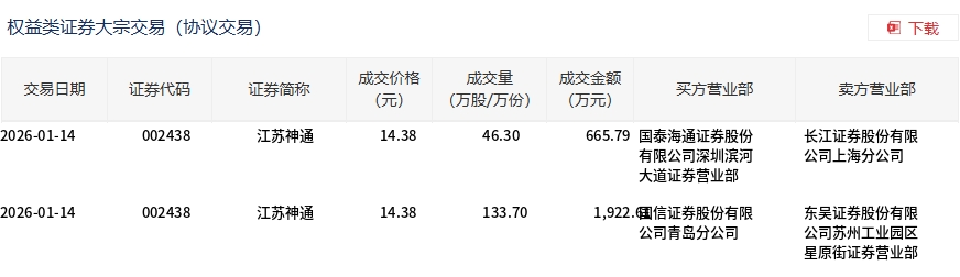 1月14日,江蘇神通大宗交易成交180萬股,成交額2588.4萬元,占當(dāng)日總成交額的6.22%,成交價(jià)14.38元,較市場收盤價(jià)15.82元折價(jià)9.1%。
