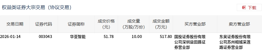 1月14日,華亞智能大宗交易成交10萬(wàn)股,成交額517.8萬(wàn)元,占當(dāng)日總成交額的1.69%,成交價(jià)51.78元,較市場(chǎng)收盤(pán)價(jià)52.57元折價(jià)1.5%。