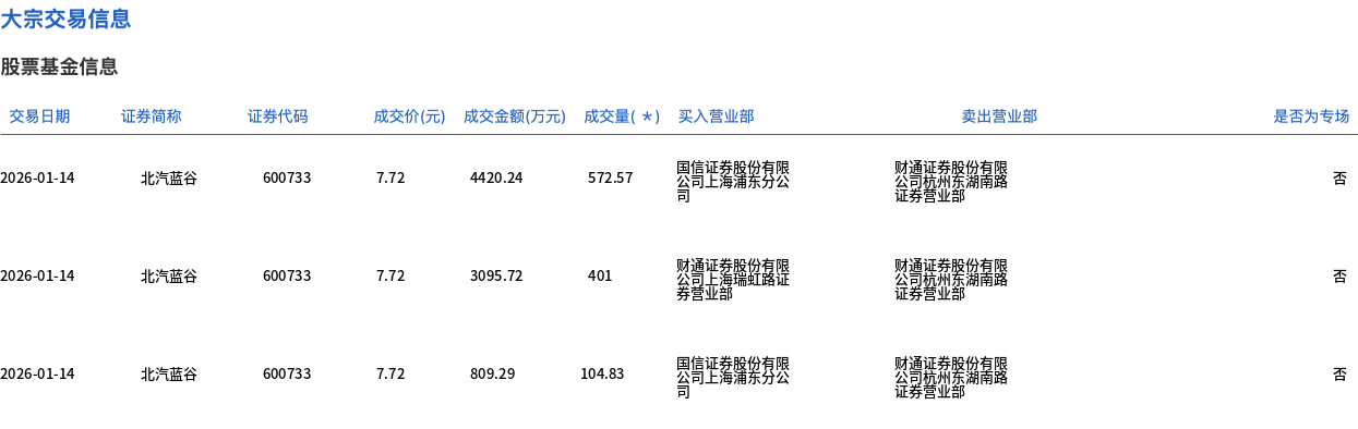 1月14日,北汽藍(lán)谷大宗交易成交1078.4萬股,成交額8325.25萬元,占當(dāng)日總成交額的4.49%,成交價7.72元,較市場收盤價8.62元折價10.44%。