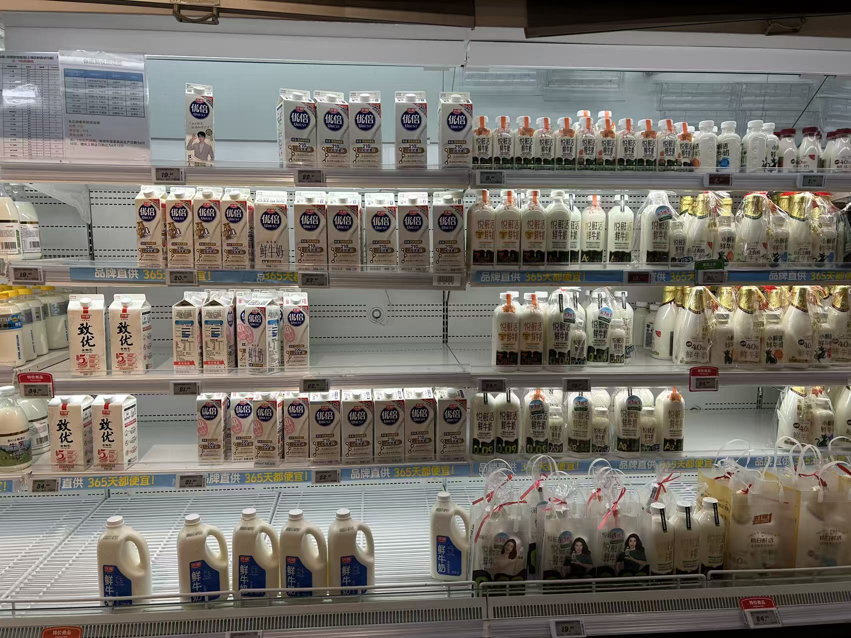 而在北京,這里的低溫牛奶以伊利、蒙牛、三元、君樂寶為主,此外還包括零售賣場(chǎng)推出的自有品牌低溫牛奶,少量渠道也有優(yōu)諾、塞上一頭牛、新乳業(yè)今日鮮奶鋪等產(chǎn)品,此前光明在北京市場(chǎng)大量鋪貨的“新鮮牧場(chǎng)”牛奶在永輝、盒馬、京客隆北京門店都無法找到。